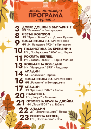 През октомври Драматично-куклен театър – Враца продължава и с турнета. Публиката в Белоградчик, Попица, Криводол, Чирен, Горна Малина, Радомир, Своге, Монтана, Лом и други населени места ще може да гледа спектаклите „Добре дошли в България 2“, „Извън контрол“, „Гимнастика за бременни“, „Роклята беглец“, „Лазарица“, „Отворена брачна двойка“, „Аладин“ и др.