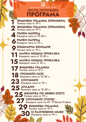 Октомври започна ударно за Драматично-куклен театър – Враца с дългоочакваната премиера на „Вишнева градина“ от Антон П. Чехов с режисьор директора на театъра Владлен Александров. Постановката, представена на 1 и 2 октомври на голяма сцена, предизвика силен интерес и беше приета с бурни аплодисменти от публиката. След този силен старт, театърът продължава месеца с разнообразна програма от спектакли за деца и възрастни – както на своята сцена, така и на турне в различни населени места в страната.