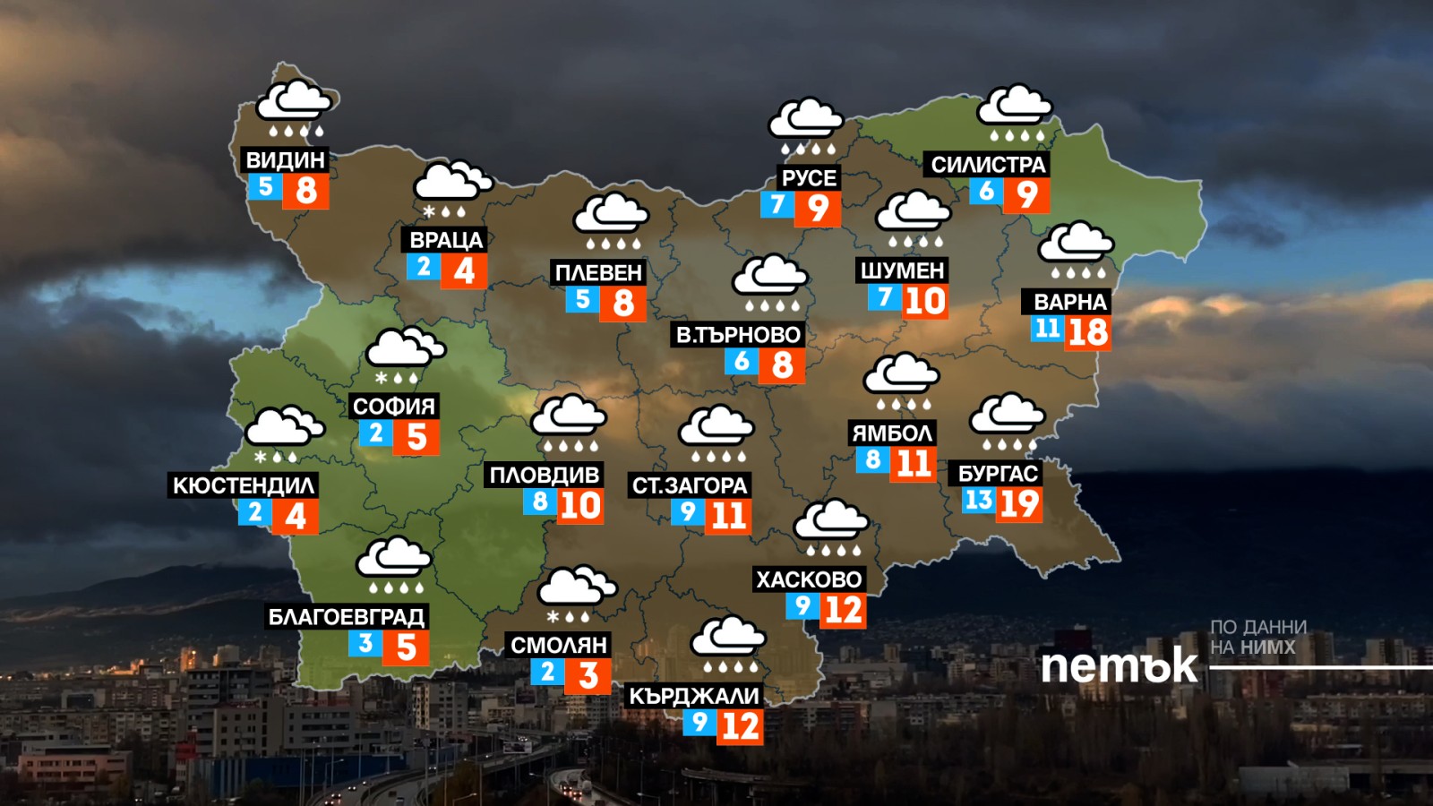България остава в плен на обширния средиземноморски циклон и в последния работен ден. До обяд почти навсякъде ще има валежи, в часовете до вечерта те ще намаляват и спират първо в Южна България, а по-късно привечер - и в Северна. Дневните температури ще бъдат от 4-5 градуса в Западна България до към 17-18 по Черноморието.
