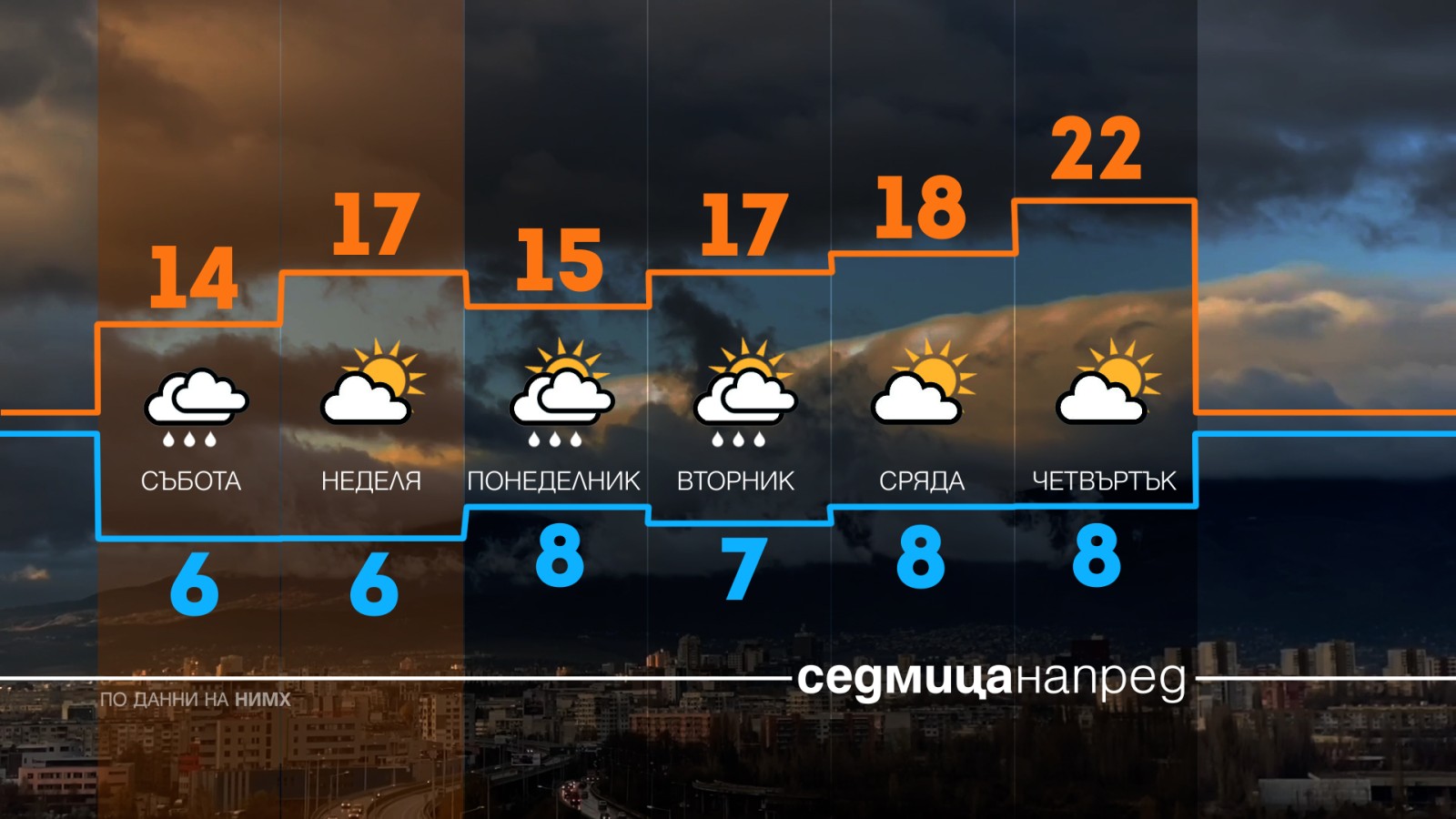 Сутрините често ще са мъгливи и студени. При ясно време ще има условия за слана. Дневните температури ще са по-ниски в началото на седмицата, след което ще се повишават. В Западна България обаче ще остане относително по-хладно.