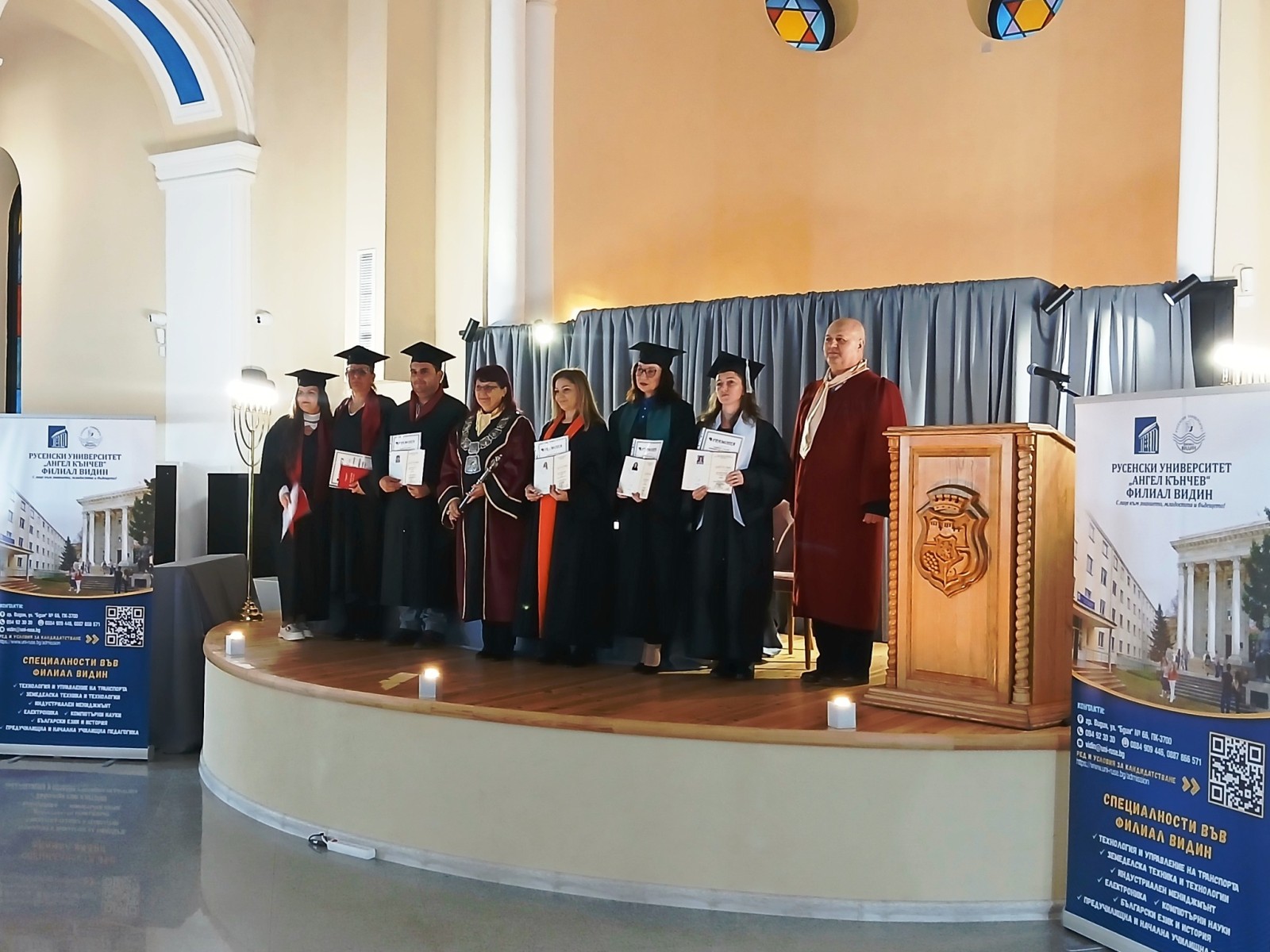 Церемонията продължи с връчването на дипломите за успешно завършено висше образование в степените „бакалавър” и „магистър” на 73-ма абсолвенти в 7 специалности на 6-я випуск на ВУЗ в нашия град. Видинския филиал на Русенския университет „Ангел Кънчев” за 10-та поредна година посрещна своите студенти. Тази година прагът му прекрачват 126 първокурсници.