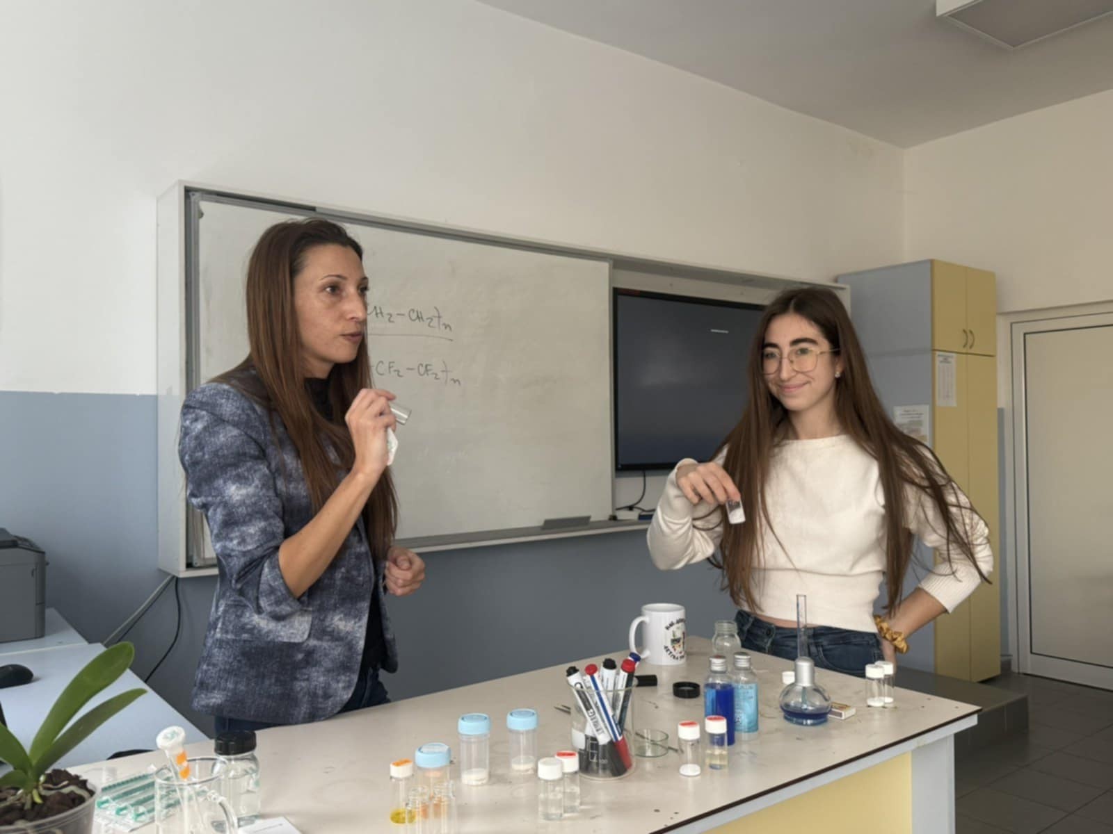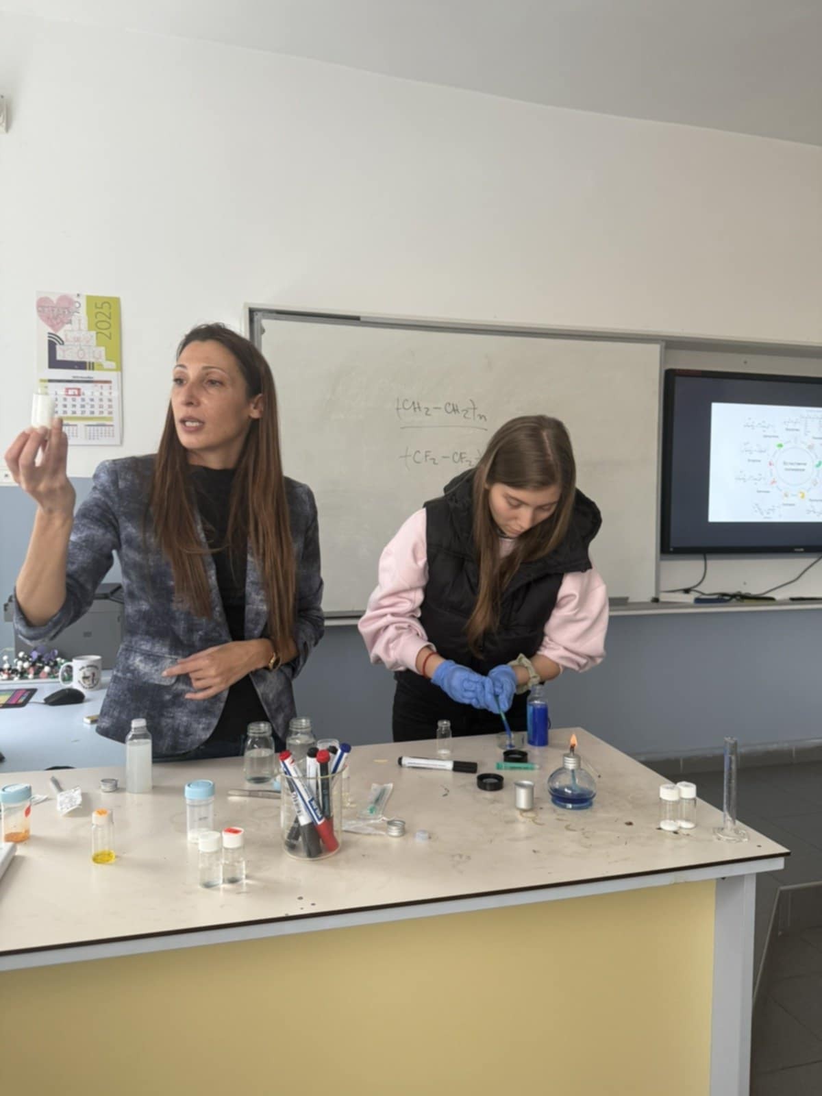 След това учениците преминаха към практическа работа, която предизвика голям интерес. Те приготвиха хидрогелове от хиалуронова киселина и наблюдаваха задържането на вода в тяхната структура, проследиха процеса на омрежване на двукомпонентен силикон, изследваха набъбването на хитозанови гелове и изработиха термочувствителен гел на основата на Плуроник. Проведените експерименти показаха как различните структури на полимерите водят до специфични свойства на получените материали.
