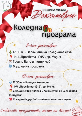 Община Мизия стартира празничната си програма с поредица от събития, посветени на коледните и новогодишните празници, и кани жителите и гостите на града да се включат в общите моменти на празнично настроение.