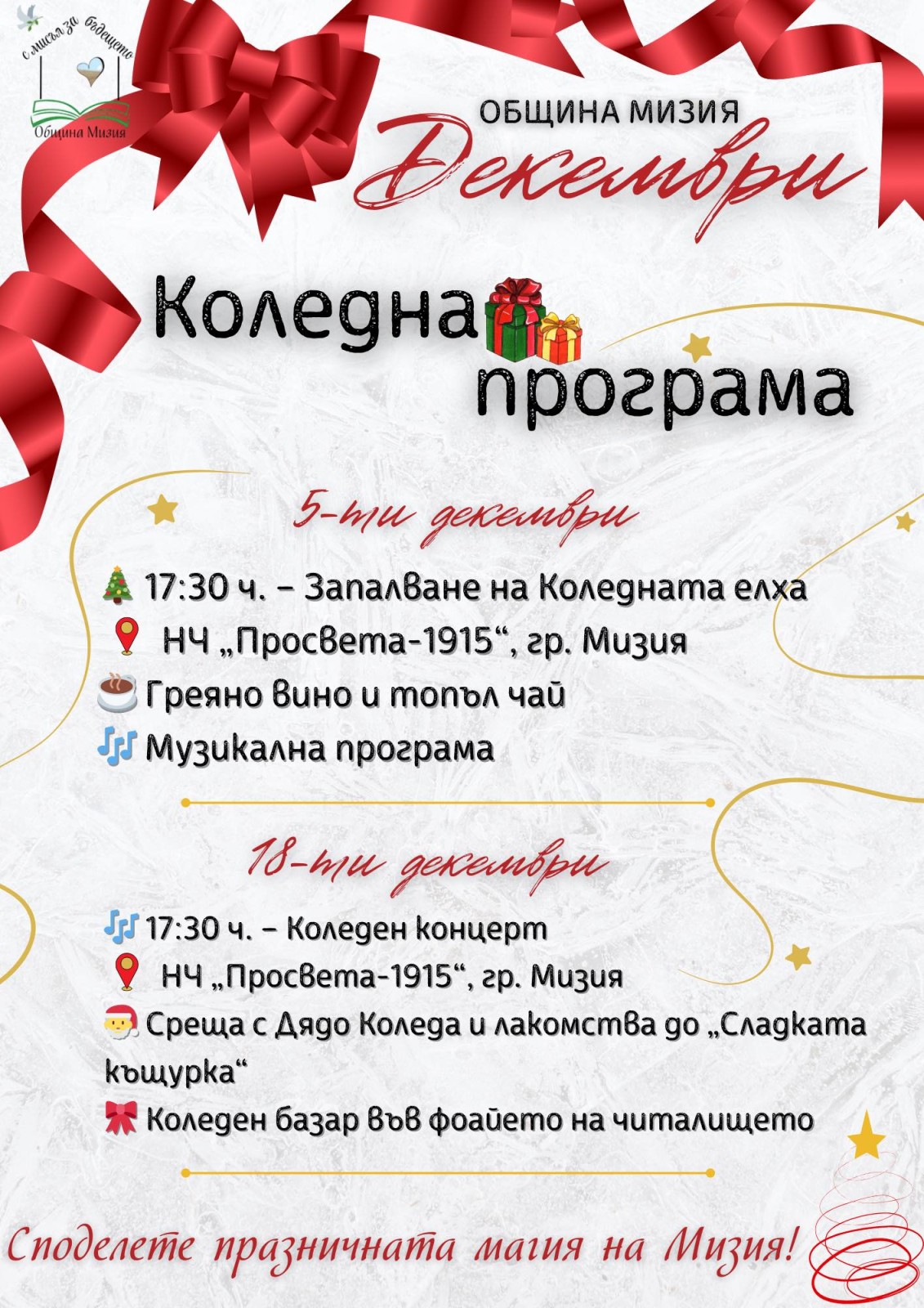 Заповядайте да споделим тези празнични вечери заедно - с настроение, усмивки и дух на общност, които превръщат Мизия в място със своя топла и жива коледна традиция!