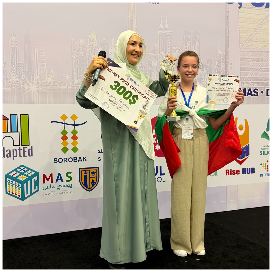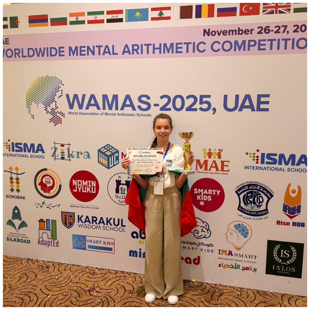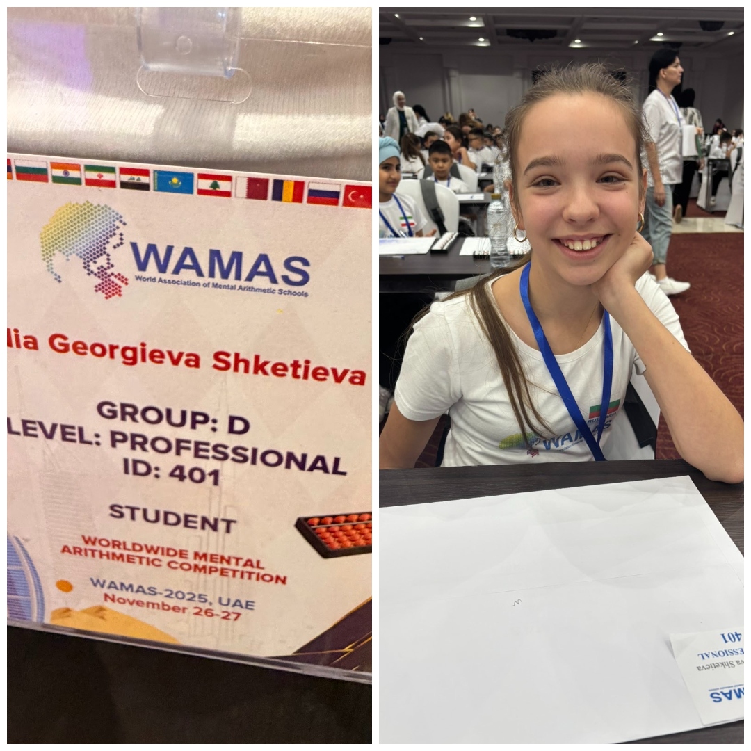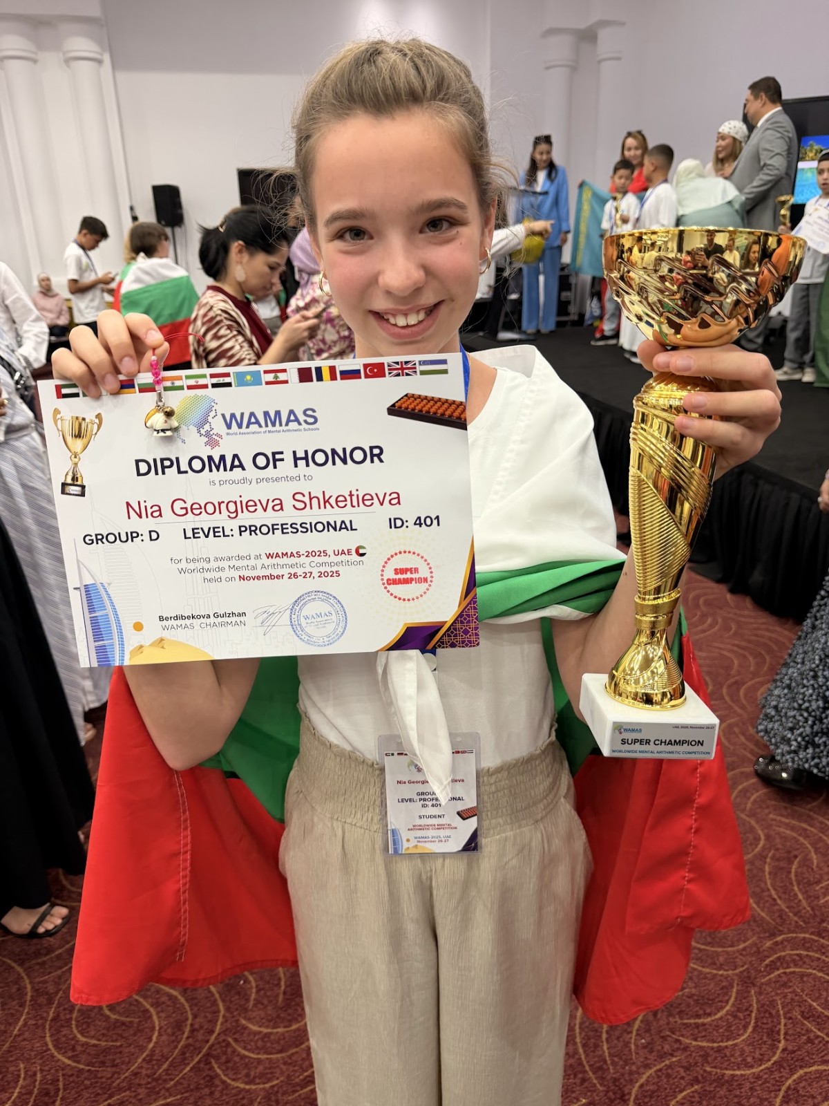 С гордост съобщаваме, че седмокласничката Ния Георгиева Шкетиева от ППМГ „Акад. Иван Ценов“ - Враца, постигна забележителен успех на Световното първенство по ментална аритметика WAMAS 2025. Състезанието се проведе в края на месец ноември в Дубай, Обединени Арабски Емирства. Представяйки България и Smarty Kids – Враца, Ния победи стотици участници от множество държави и спечели престижната титла СУПЕРШАМПИОН WAMAS 2025.