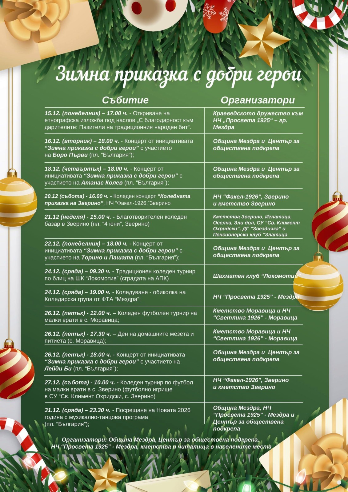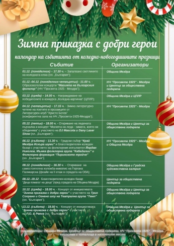 • 01-04.12.2025 г. (понеделник-четвъртък) - 11:00 ч. - НЧ „Просвета 1925“: Образователни концерти „Магията на българския фолклор“ за възпитаниците на детските градини и начален етап на обучение в училищата в гр. Мездра.