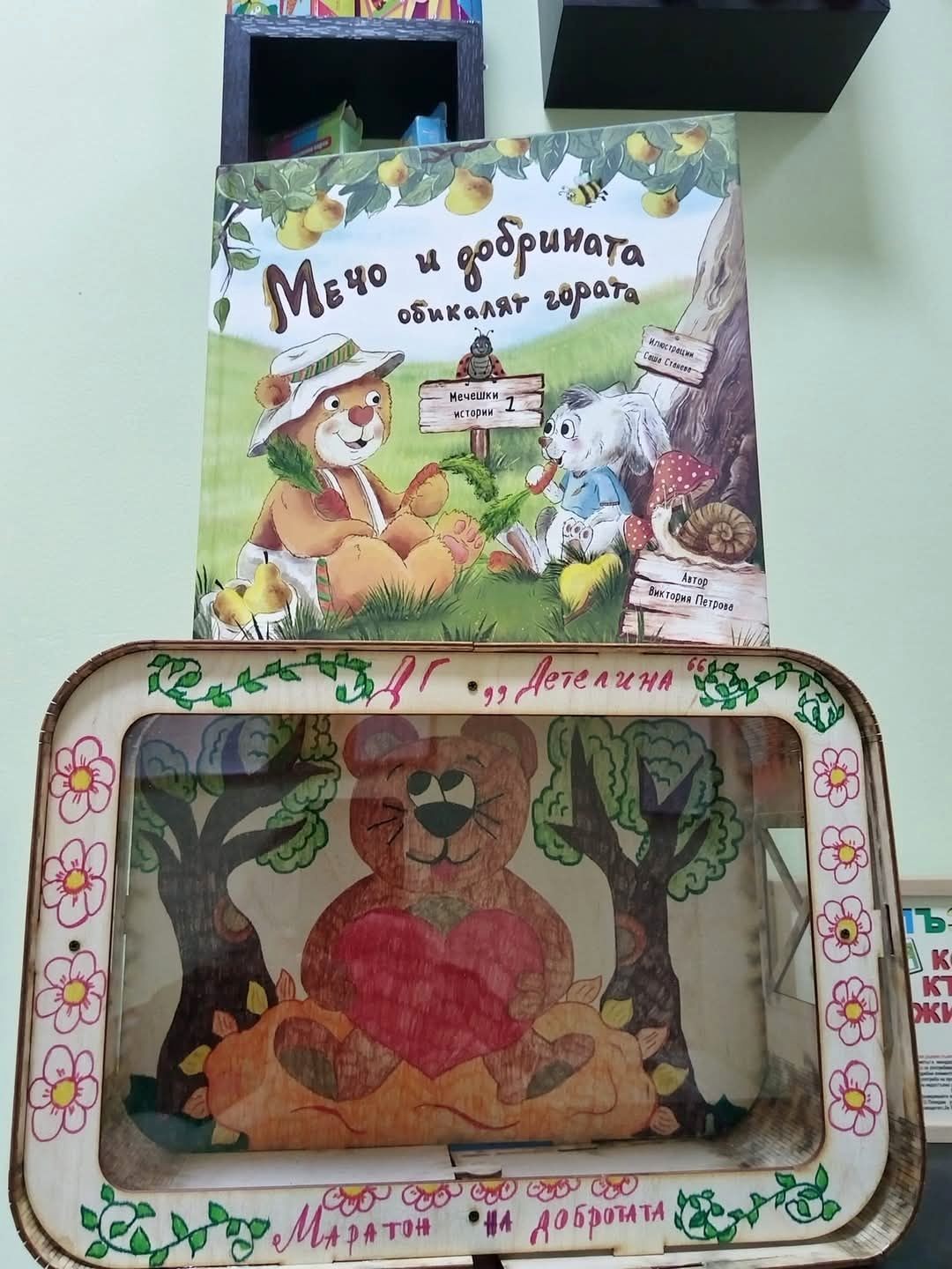 „След като се запознахме с добрините на катеричката, мечо, зайко и пчелите от книжката „Мечо и добрината обикалят гората“, поставихме специално изработена и ръчно нарисувана дървена кутия за добрини, в която нашите деца с помощта на своите родители поставиха своите добрини - красиви детски жестове или послания, вдъхновени от Мечето от книжката „Мечо и добрината обикалят гората“, поясни психолог Цветелина Иванова.