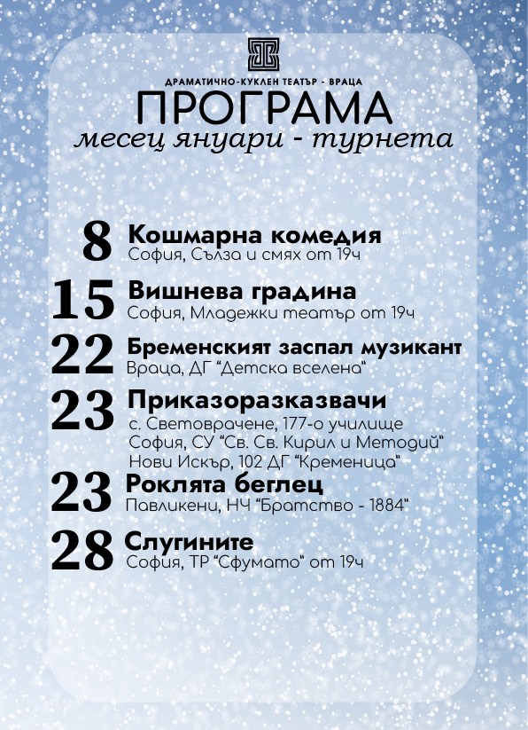 С януарската си програма Драматично-куклен театър – Враца заявява още в началото на 2026 година своята последователна политика за жанрово разнообразие и активен диалог с публиката.