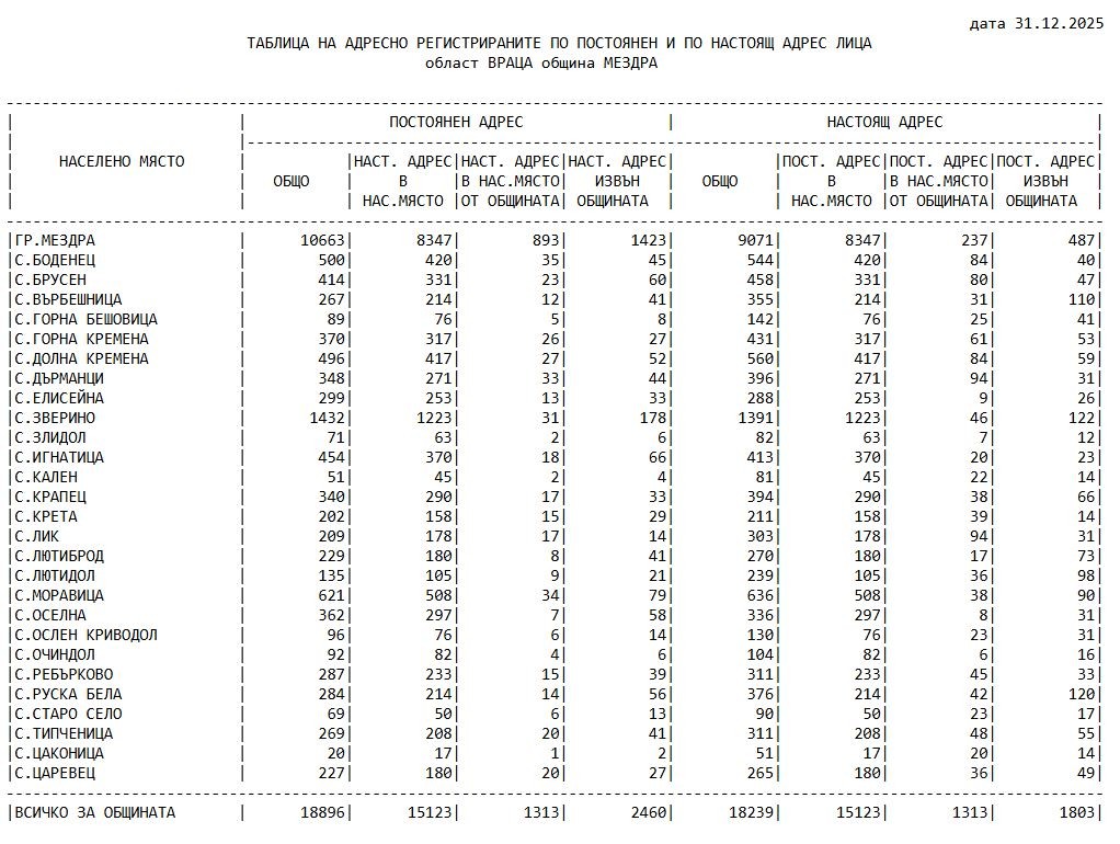 За гр. Мездра данните са: 10 663 жители с постоянен адрес в града към 31.12.2025 г., при 10 771 към 31.12.2024 г. или отрицателен прираст от 108 души. По настоящ адрес адресно регистрираните в гр. Мездра към 31 декември м. г. са 9 071, което е с 67 по-малко спрямо тези към 31.12.2024 г.