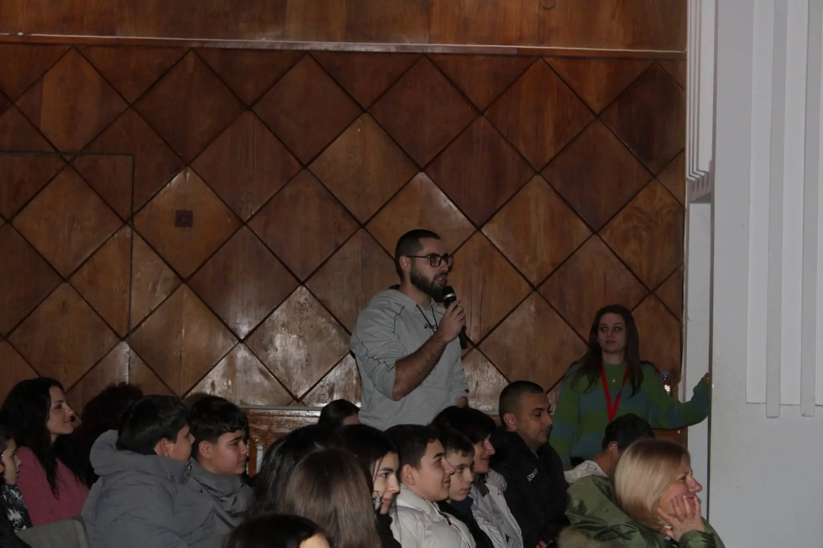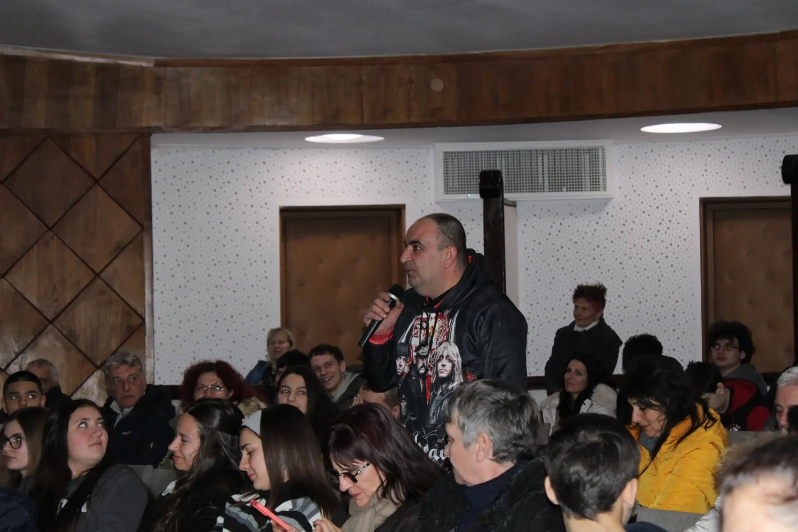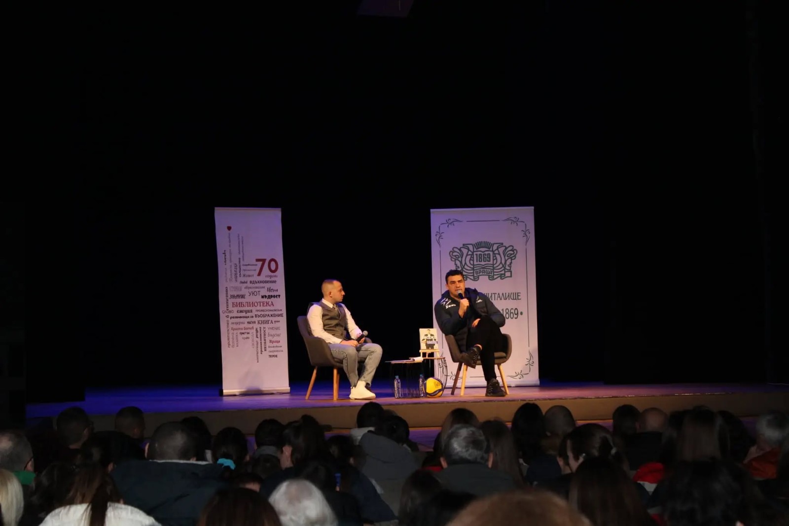 Залата на Народно читалище "Развитие-1869" беше пълна - ученици, млади хора, преподаватели, родители, волейболни отбори и треньори. Въпросите преминаха през мотивацията, клуба, тренировките, строгите правила и как се стига до върха.