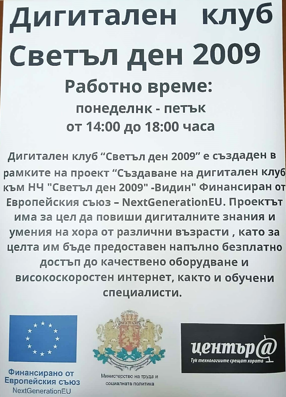 Заместник-кметът на община Видин по хуманитарни дейности и социална политика Борислава Борисова откри официално нов дигитален клуб в Народно читалище „Светъл ден 2009“. Общо 15 читалища на територията на общината и Регионалната библиотека „Михалаки Георгиев“ спечелиха проекти за разкриване на дигитални клубове по мярка „Изграждане на мрежа от дигитални клубове“. Те са в изпълнение на инвестиция „Предоставяне на обучения за дигитални умения и създаване на платформа за обучение на възрастни“ на Министерството на труда и социалната политика, която се финансира по Националния план за възстановяване и устойчивост.