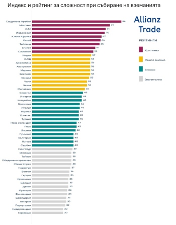 Данните в Allianz Trade Collection Complexity Score and Rating показват още, че 48% от международните търговски вземания са в държави с „много висок“ риск