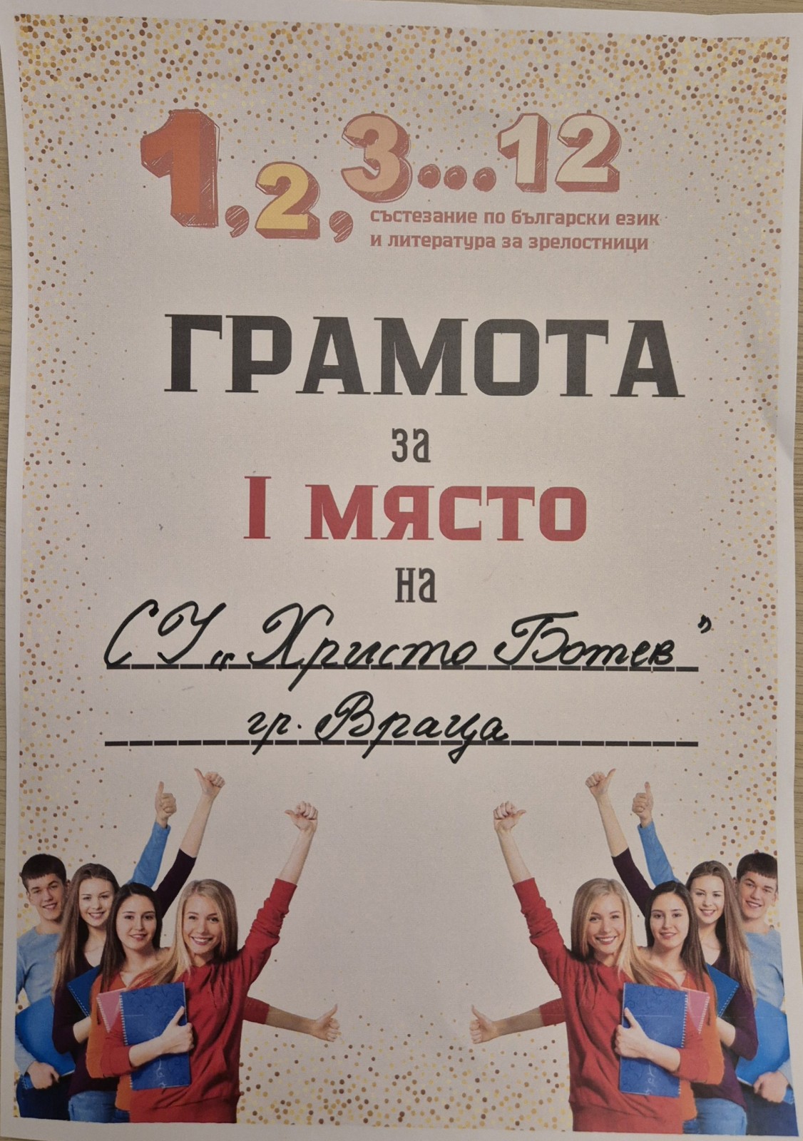 В спор с още шест отбора от най-добрите врачански училища екипът на 12.А клас спечели 1. място в състезанието по БЕЛ за зрелостници „1,2,3…12“, организирано от Регионалното управление на образованието – Враца. Отборът ни „Бяла врана“ водеше еднолично от първия до последния кръг. Впечатляващ е постигнатият резултат, който е с една точка под максимално възможния!