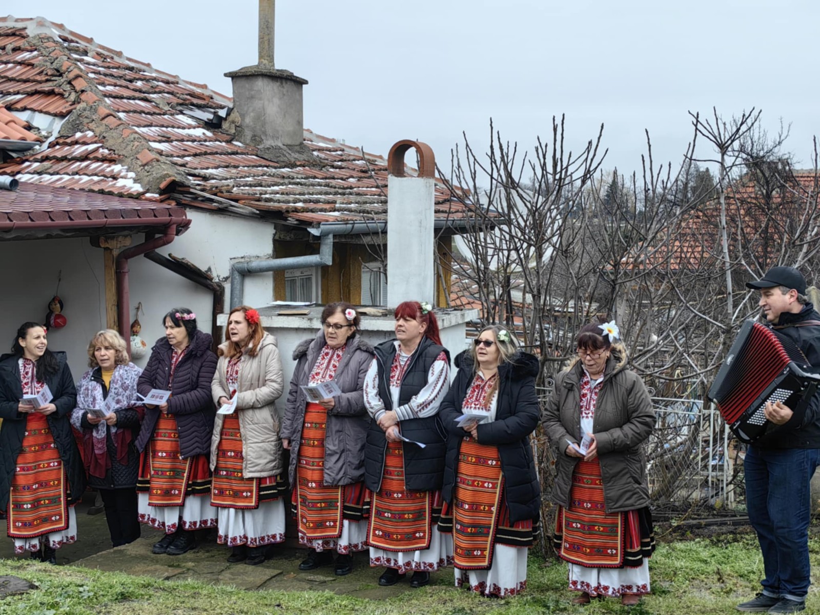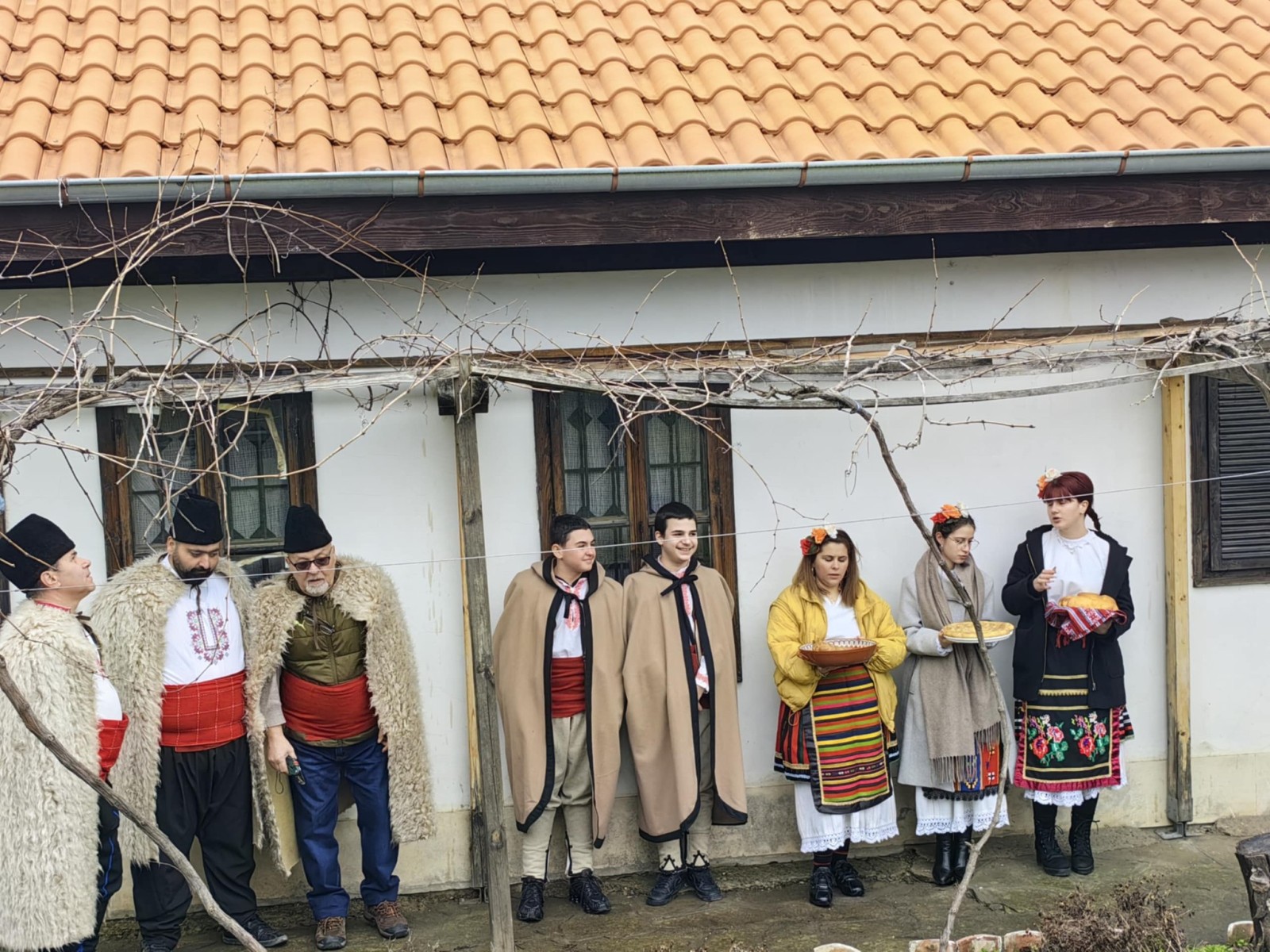Самодейките, пременени като грижовни стопанки, сложиха на масата топла питка, вкусна баница, печено пиле и домашно вино – дарове, които символизират гостоприемството и богатството на българската трапеза.