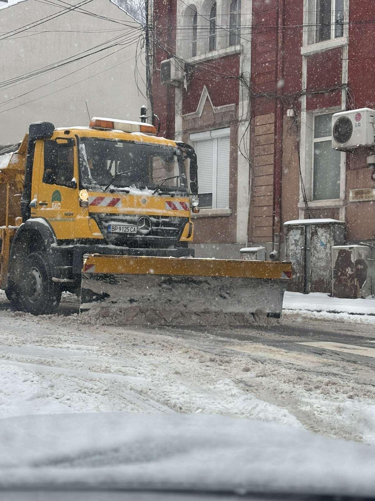Екипите на БКС са на терен още от 05:00 часа тази сутрин, като 5 снегорина извършват обработка на пътната мрежа в града против заледяване, както и почистване на снега.