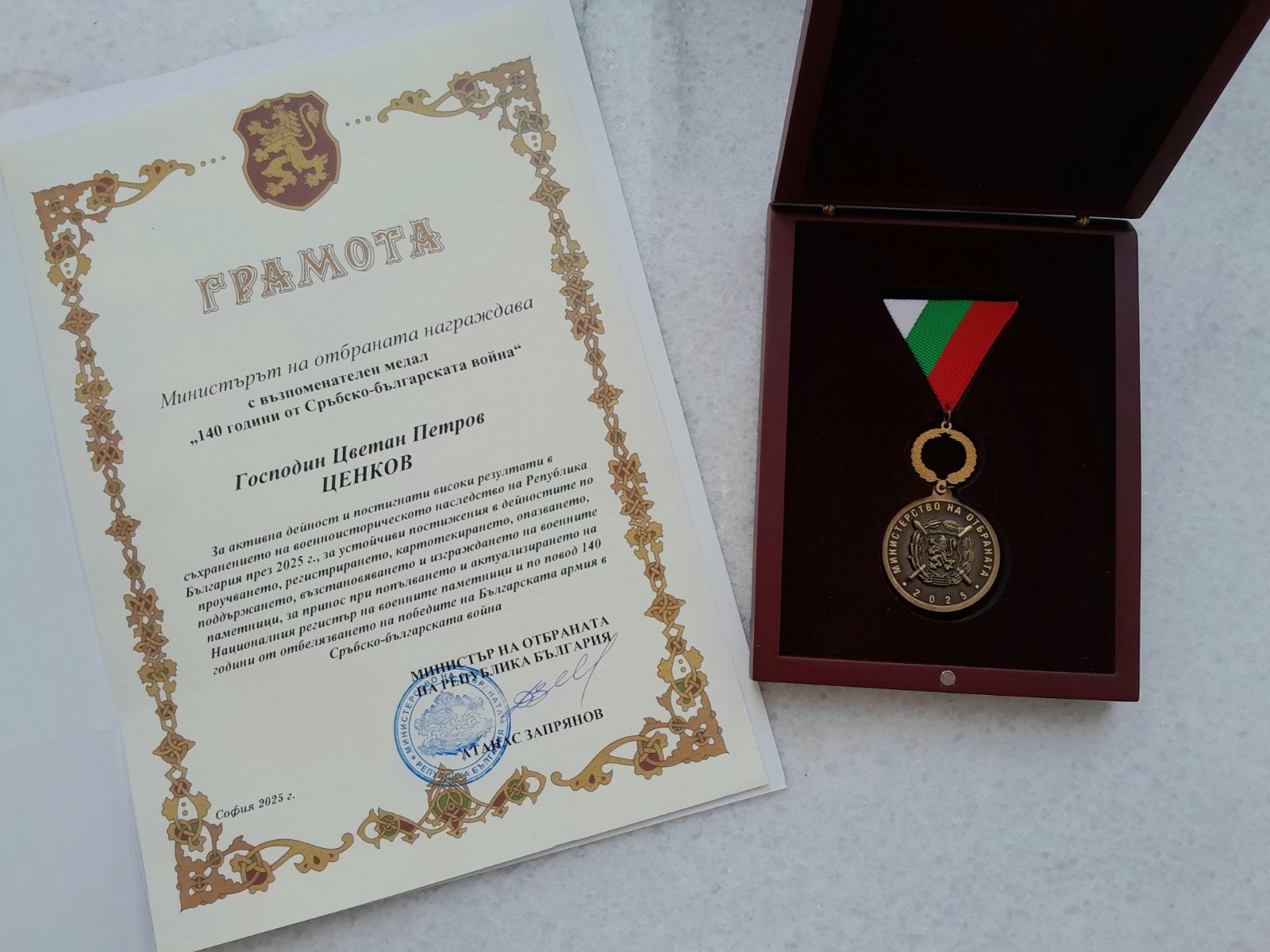Кметът д-р Цветан Ценков бе удостоен с грамота и възпоменателен медал „140 години от Сръбско-българската война“ от министъра на отбраната на Република България за устойчиви постижения и резултати в дейностите по опазване на военните паметници на територията на Община Видин.