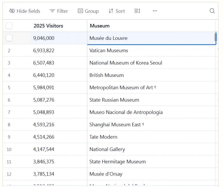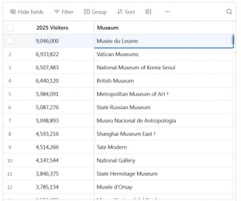 Musée du Louvre продължава да е начело в класацията, въпреки проблеми като кражби, измами с билети и оставка на директора. Музеят дори увеличава посетителите си и през 2025 г. отчита над 9 милиона посещения.