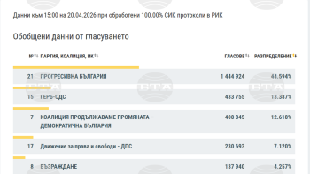 При 100% обработени протоколи „Прогресивна България“ е с 44,6% подкрепа, втори са ГЕРБ-СДС с 13,4%, съобщиха от ЦИК